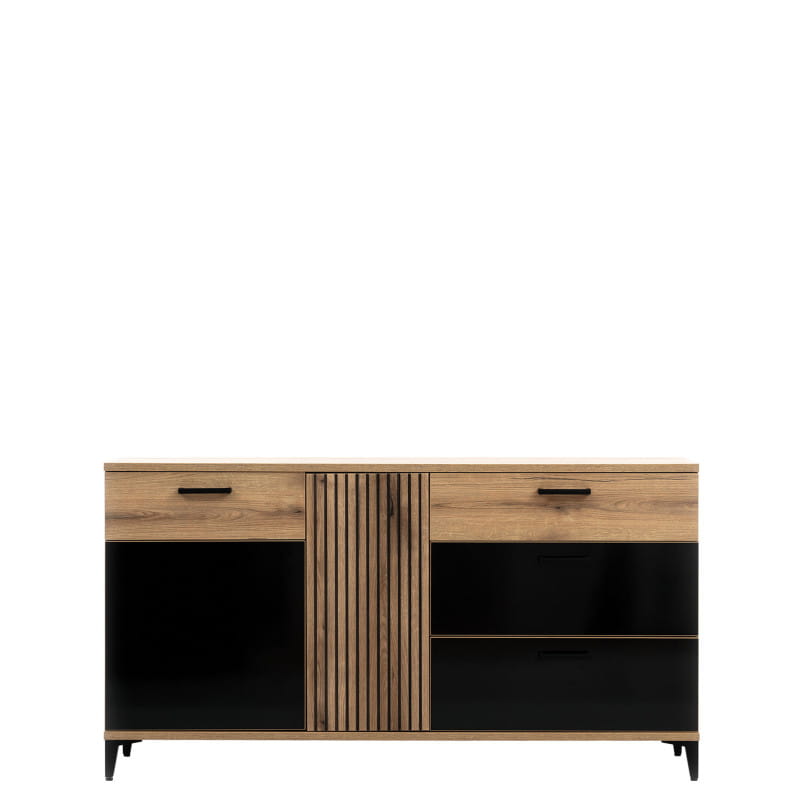 Szafka RTV ARIS AS01 to szeroka szafka telewizyjna, która pozwoli uporządkować strefę wypoczynkową. Doskonale zaplanowana przestrzeń stworzy bazę pod sprzęt elektroniczny i inne niezbędne przedmioty. Mebel wyposażony został w dwie pojemne szuflady, zamkniętą przestrzeń oraz dwie otwarte wnęki. Szafka świetnie pasuje do przestrzeni utrzymanych w nowoczesnym stylu. Swoją uwagę przykuwa dzięki modnemu połączeniu kolorystycznemu. Czarne fronty w połysku w zestawieniu z dekorem drewna wzbogaconym efektem lameli nadają wnętrzu elegancji. Natomiast wysokie czarne nóżki w połączeniu z czarnymi uchwytami powodują że szafka RTV jest dekoracją samą w sobie. Szafka RTV idealnie sprawdzi się w konfiguracji z półką AS13 lub innymi bryłami z serii ARIS, ale również jako pojedynczy mebel, który można dopasować do własnej aranżacji pomieszczenia.