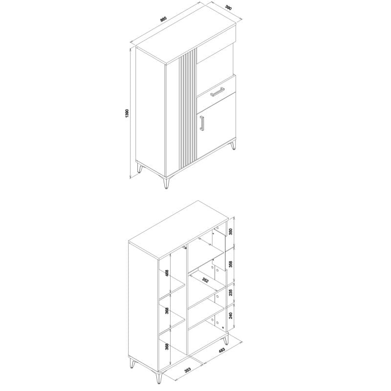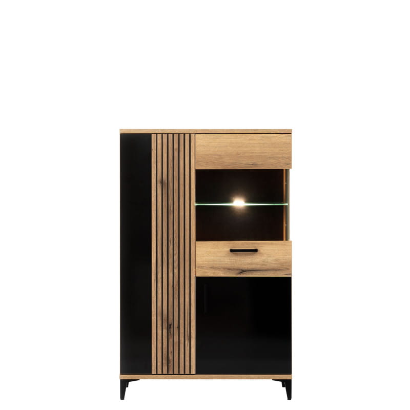 Witryna ARIS AS06 idealnie odnajdzie się w salonie, pokoju dziennym lub jadalni eksponując ozdoby jak choćby porcelanę na szklanej półce, którą można dodatkowo podświetlić za pomocą LED, dostępnego w opcji. Trzydrzwiowa witryna posiada dwie zamykane szafki z praktycznymi półkami w środku, które pozwolą rozsądnie uporządkować potrzebne przedmioty. Witryna świetnie pasuje do przestrzeni utrzymanych w nowoczesnym stylu. Swoją uwagę przykuwa dzięki modnemu połączeniu kolorystycznemu. Czarne fronty w połysku w zestawieniu z dekorem drewna wzbogacone efektem lameli nadają wnętrzu elegancji. Natomiast wysokie czarne nóżki w połączeniu z czarnymi uchwytami powodują że witryna jest dekoracją samą w sobie. Witryna idealnie sprawdzi się w konfiguracji z innymi bryłami z serii ARIS lub jako pojedynczy mebel, który można dopasować do własnej aranżacji pomieszczenia.