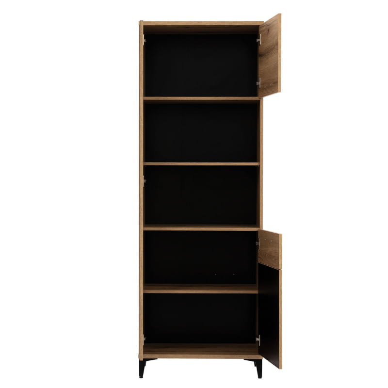 Regał L/P ARIS AS09 świetnie sprawdzi się w kameralnej przestrzeni salonu lub sypialni czy pokoju młodzieżowego. Przestrzeń regału podzielono na część zamkniętą oraz otwartą. Półki ukryte za drzwiami można wykorzystać na tekstylia czy drobne akcesoria, a dwie otwarte wnęki idealnie nadadzą się do ustawienia kolekcji książek czy elementów dekoracyjnych. Ma on charakter uniwersalny, można zdecydować, czy drzwi maja otwierać się na prawą, czy na lewą stronę. Regał świetnie pasuje do przestrzeni utrzymanych w nowoczesnym stylu. Swoją uwagę przykuwa dzięki modnemu połączeniu kolorystycznemu. Czarne fronty w połysku w zestawieniu z dekorem drewna wzbogacone efektem lameli nadają wnętrzu elegancji. Natomiast wysokie czarne nóżki w połączeniu z czarnymi uchwytami powodują że regał jest dekoracją samą w sobie. Regał idealnie sprawdzi się w konfiguracji z innymi bryłami z serii ARIS lub jako pojedynczy mebel, który można dopasować do własnej aranżacji pomieszczenia.