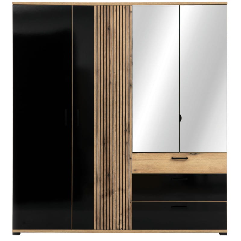 Modna i praktyczna szafa czterodrzwiowa ARIS AS11 świetnie sprawdzi się w przestrzeni sypialni czy garderoby. Dzięki trzem drążkom odwiesisz koszule, spodnie, spódnice, sukienki co pozwoli uzyskać wygodny dostęp do poszczególnych elementów twojej garderoby. Trzy pojemne szuflady zapewnią miejsce do przechowywania galanterii i bielizny. Szafę można doposażyć w dodatkowe półki ARIS AS12, które ułatwią uporządkowanie elementów garderoby. Dwa lustra na froncie posłużą nie tylko do przeglądanie się, ale również powiększą optycznie pomieszczenie. Szafa świetnie pasuje do przestrzeni utrzymanych w nowoczesnym stylu. Swoją uwagę przykuwa dzięki modnym połączeniu kolorystycznemu. Czarne fronty w połysku w zestawieniu z dekorem drewna wzbogacone efektem lameli nadają wnętrzu elegancji. Natomiast wysokie czarne nóżki w połączeniu z czarnymi uchwytami powodują że szafa jest dekoracją samą w sobie. Szafa idealnie sprawdzi się w konfiguracji z innymi bryłami z serii ARIS lub jako pojedynczy mebel, który można dopasować do własnej aranżacji pomieszczenia.