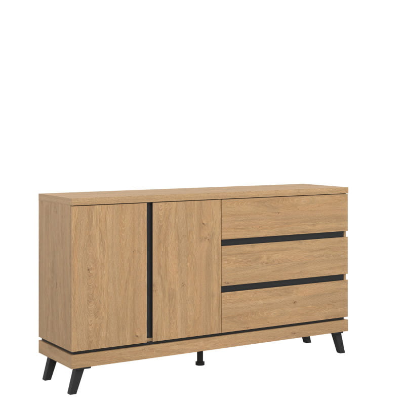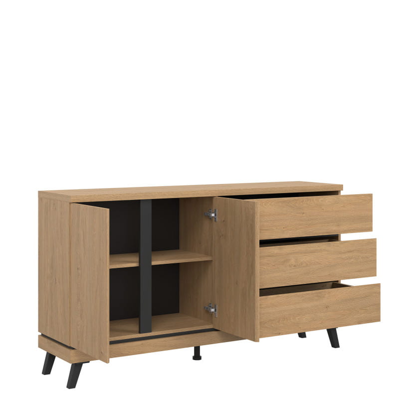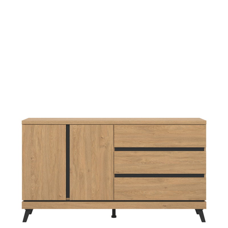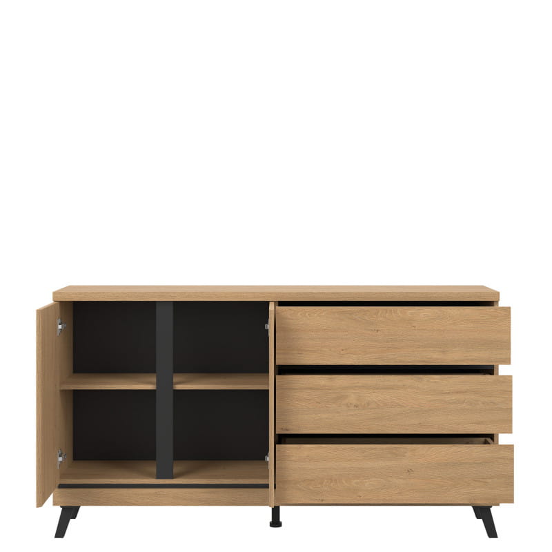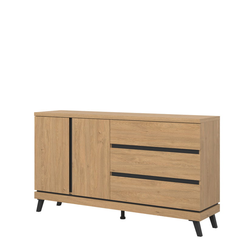 Komoda ATE AT03 o uniwersalnym zastosowaniu wyposażona została w trzy szuflady przestronną szafkę z jedna półką, która umożliwi dobrą organizację dla potrzebnych drobiazgów. Duża powierzchnia blatu pozwoli na wyeksponowanie dekoracji. Kolekcja ATE utrzymana jest w modnym kolorze dąb kamienny, który w połączeniu z czarnymi wstawkami zapewnia kontrastowe połączenie, które przyciąga uwagę i nadaje pomieszczeniu elegancji. Mebel otwiera się za pomocą specjalnie wyprofilowanych żłobień na obrzeżu frontu. Komoda idealnie sprawdzi się w konfiguracji z innymi bryłami z serii ATE lub jako pojedynczy mebel, który można dopasować do własnej aranżacji pomieszczenia.