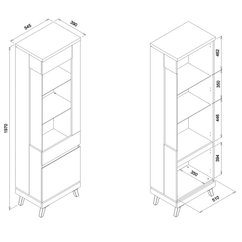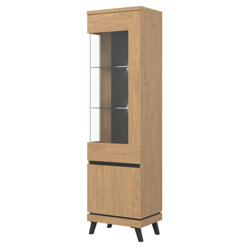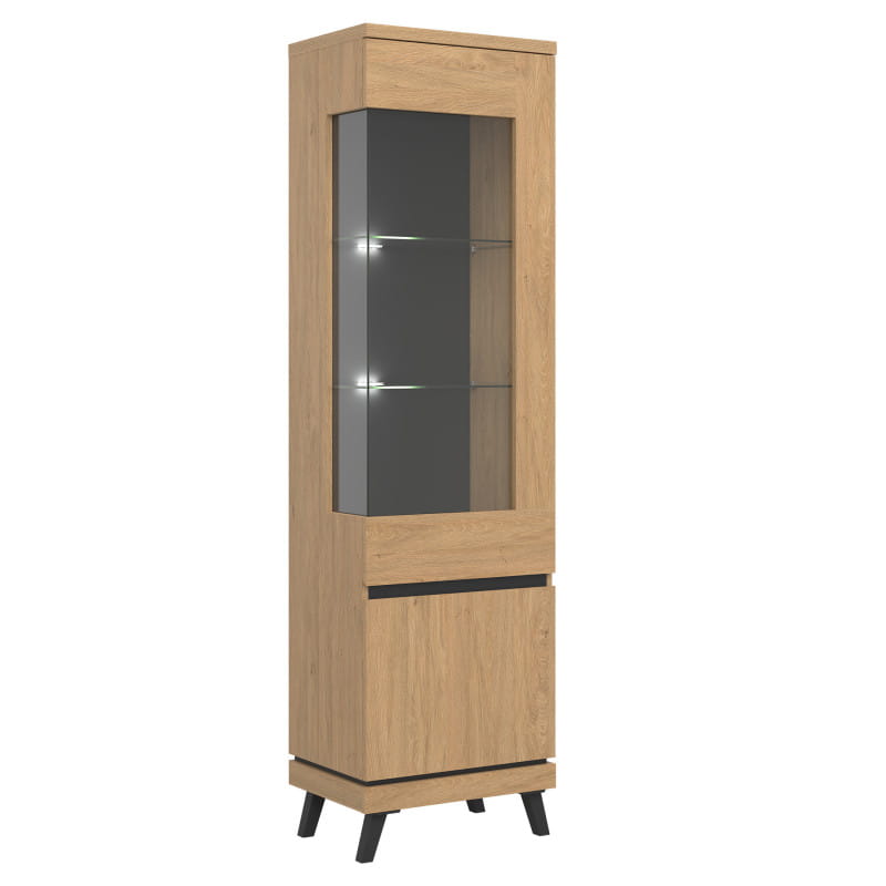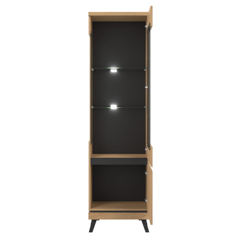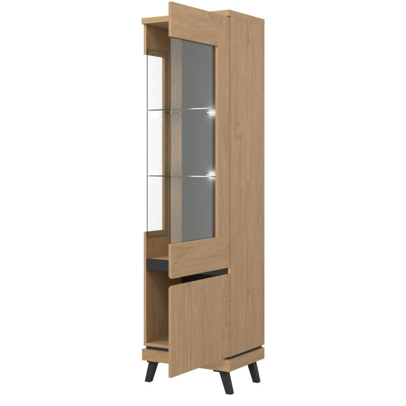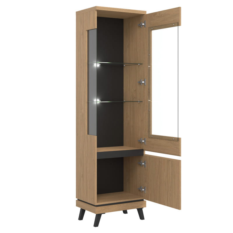 Witryna prawa ATE AT06 znajdzie swoje miejsce w salonie, sypialni oraz pokoju dziennym. Na dwóch szklanych półkach za częściowo przeszklonym frontem można ustawić dekoracje, które mogą zostać podświetlone za pomocą LED (opcja). Poniżej za pełnymi drzwiami znajduje się wnęka na pozostałe przedmioty. Kolekcja ATE utrzymana jest w modnym kolorze dąb kamienny, który w połączeniu z czarnymi wstawkami zapewnia kontrastowe połączenie, które przyciąga uwagę i nadaje pomieszczeniu elegancji. Mebel otwiera się za pomocą specjalnie wyprofilowanych żłobień na obrzeżu frontu. Witryna prawa idealnie sprawdzi się w konfiguracji z innymi bryłami z serii ATE lub jako pojedynczy mebel, który można dopasować do własnej aranżacji pomieszczenia.