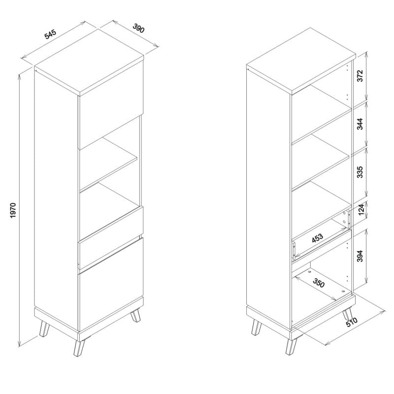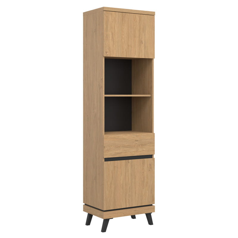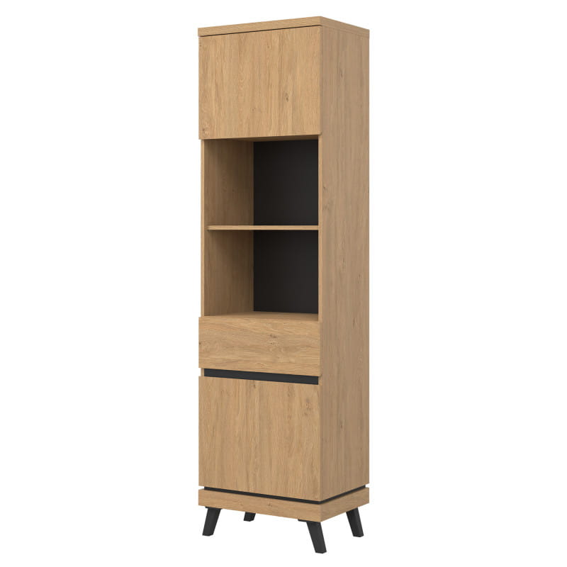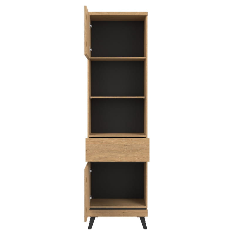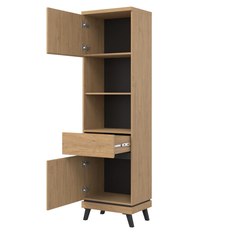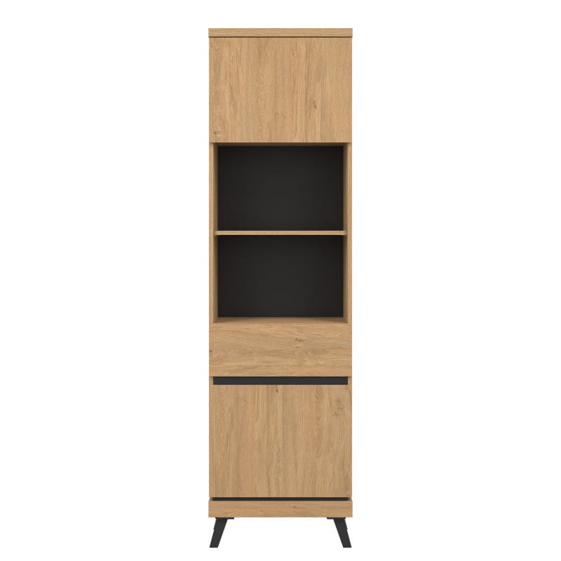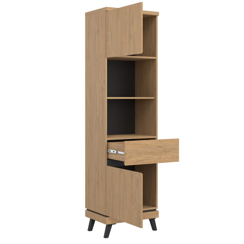 Regał L/P ATE AT07 to funkcjonalny i niezbędny element w salonie lub domowym gabinecie. Górną i dolną część regału stanowi szafka z pełnymi drzwiczkami, doskonała do przechowywania dokumentów czy drobnych elementów garderoby. Środkową odkrytą półkę zapełnisz pamiątkami, czy modnymi dekoracjami. Dodatkowe miejsce do przechowywania tworzy szuflada umieszczona pod wnęką. Kolekcja ATE utrzymana jest w modnym kolorze dąb kamienny, który w połączeniu z czarnymi wstawkami zapewnia kontrastowe połączenie, które przyciąga uwagę i nadaje pomieszczeniu elegancji. Mebel otwiera się za pomocą specjalnie wyprofilowanych żłobień na obrzeżu frontu. Regał L/P idealnie sprawdzi się w konfiguracji z innymi bryłami z serii ATE lub jako pojedynczy mebel, który można dopasować do własnej aranżacji pomieszczenia.