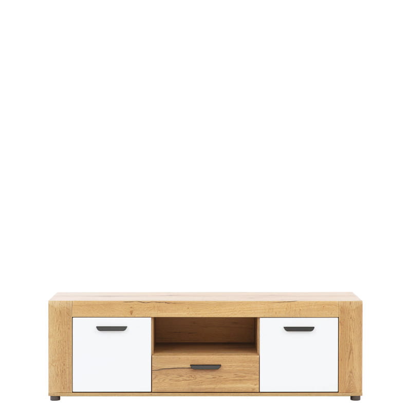Szafka RTV BESTO BT01 to niebanalna, estetyczna szafka z najwyższą funkcjonalnością, która doskonale sprawdzi się w salonie w kąciku wypoczynkowym. Dzięki szufladzie oraz dwóm pojemnym wnękom pomieści wszystkie urządzenia elektroniczne i drobne akcesoria. Na blacie można postawić telewizor lub pięknie wyeksponować dekoracje. Jasne drewno, białe fronty i proste grafitowe uchwyty idealnie pasują do wnętrz jasnych, wzbogaconych drewnianymi elementami dekoracyjnymi. Szafka RTV idealnie sprawdzi się w kompozycji z innymi bryłami z serii BESTO lub jako pojedynczy mebel, który można dopasować do własnej aranżacji pomieszczenia.