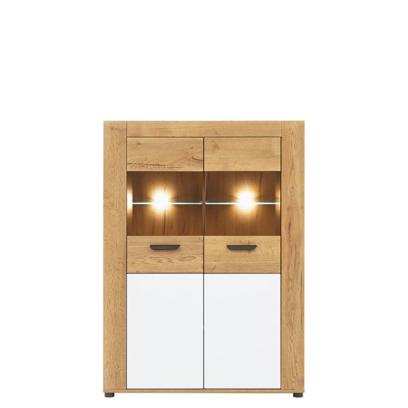 Kredens BESTO BT04 to elegancka i ciekawa propozycja do salonu lub jadalni, idealna do przechowywania oraz jako mebel dekoracyjny. W centralnej części kredensu znajduje się witryna z przeszklonym frontem, gdzie można wyeksponować dekoracje lub szkło, w dolnej nie przeszklonej, szafka z dwiema wnękami na pozostałe przedmioty. Eksponowane szkło lub dekoracje możesz dodatkowo podkreślić, dobierając podświetlenie LED. Jasne drewno, białe fronty i proste grafitowe uchwyty idealnie pasują do wnętrz jasnych, wzbogaconych drewnianymi elementami dekoracyjnymi. Kredens idealnie sprawdzi się w kompozycji z innymi bryłami z serii BESTO lub jako pojedynczy mebel, który można dopasować do własnej aranżacji pomieszczenia.