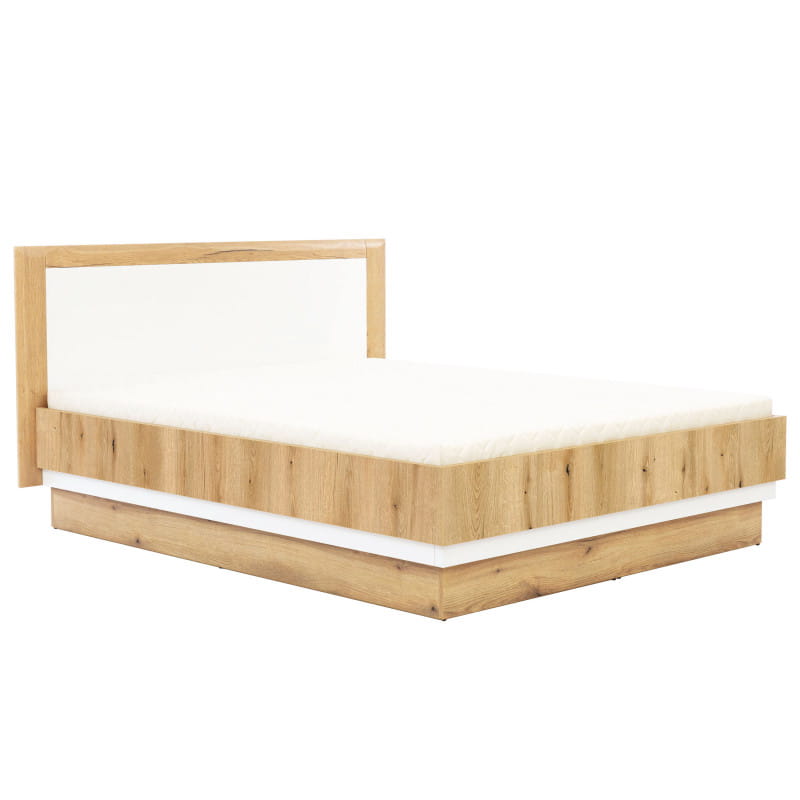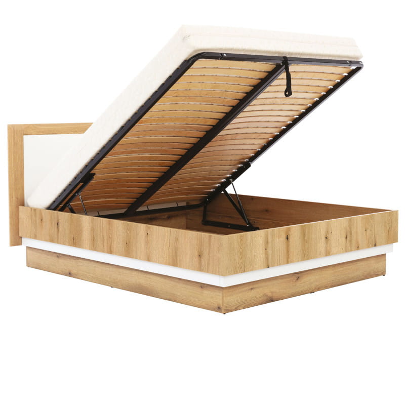 Łoże BESTO BT12 to nieodłączny element wyposażenia każdej sypialni. Prezentuje się nowocześnie i stylowo. Łoże posiada metalowy stelaż z funkcją podnoszenia na podnośnikach hydraulicznych, który gwarantuje odpowiednie podparcie materaca na całej jego szerokości. Zostało wyposażone również w duży pojemnik na pościel, materac natomiast należy zakupić osobno. Jasne drewno w połączeniu z białym zagłowiem idealnie pasują do wnętrz jasnych, wzbogaconych drewnianymi elementami dekoracyjnymi. Dostępne w trzech wymiarach: 140 cm,160 cm,180 cm łoże, idealnie sprawdzi się w konfiguracji z innymi bryłami z serii BESTO lub jako pojedynczy mebel, który można dopasować do własnej aranżacji pomieszczenia.