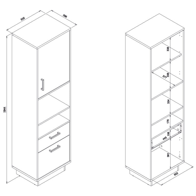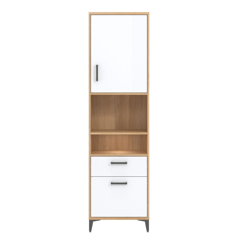 Szafka COLIN CN07 będzie świetnym uzupełnieniem nowoczesnej i eleganckiej aranżacji salonu, jak i każdego innego pomieszczenia. Szafka wyposażona jest w szufladę, dwie komory otwarte oraz dwie zamknięte które zapewnią sporo miejsca na przechowanie domowych tekstyliów, ubrań i dodatków. Jej nieduża szerokość pozwoli na wkomponowanie mebla nawet w niewielką przestrzeń. Szafkę można doposażyć w oświetlenie LED (za dopłatą), dzięki czemu mebel zaprezentuje się niezwykle elegancko. Na uwagę zasługują również minimalistyczne, szare uchwyty oraz stabilna klasyczna podstawa. Szafka idealnie sprawdzi się w kompozycji z innymi bryłami z serii COLIN, lub jako pojedynczy mebel, który można dopasować do własnej aranżacji pomieszczenia.