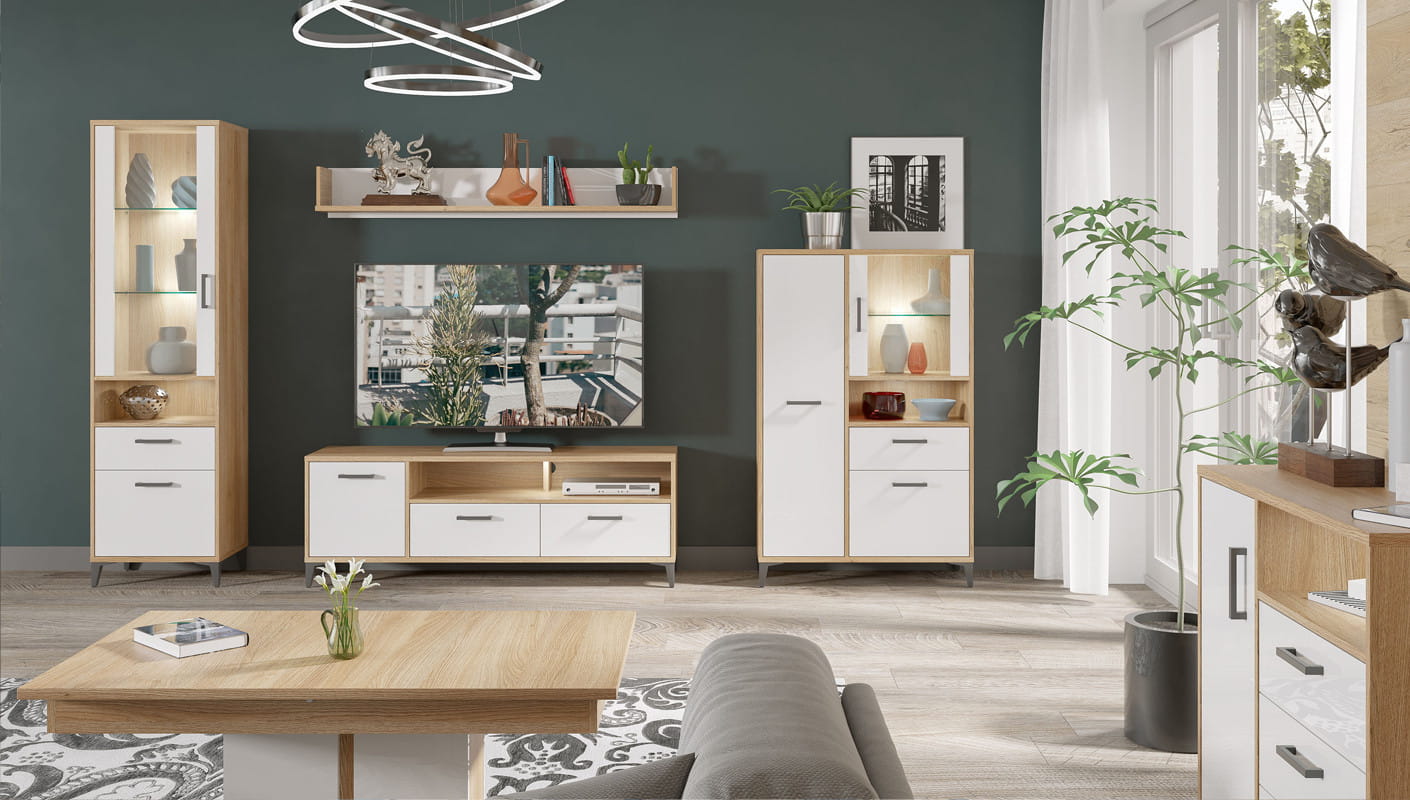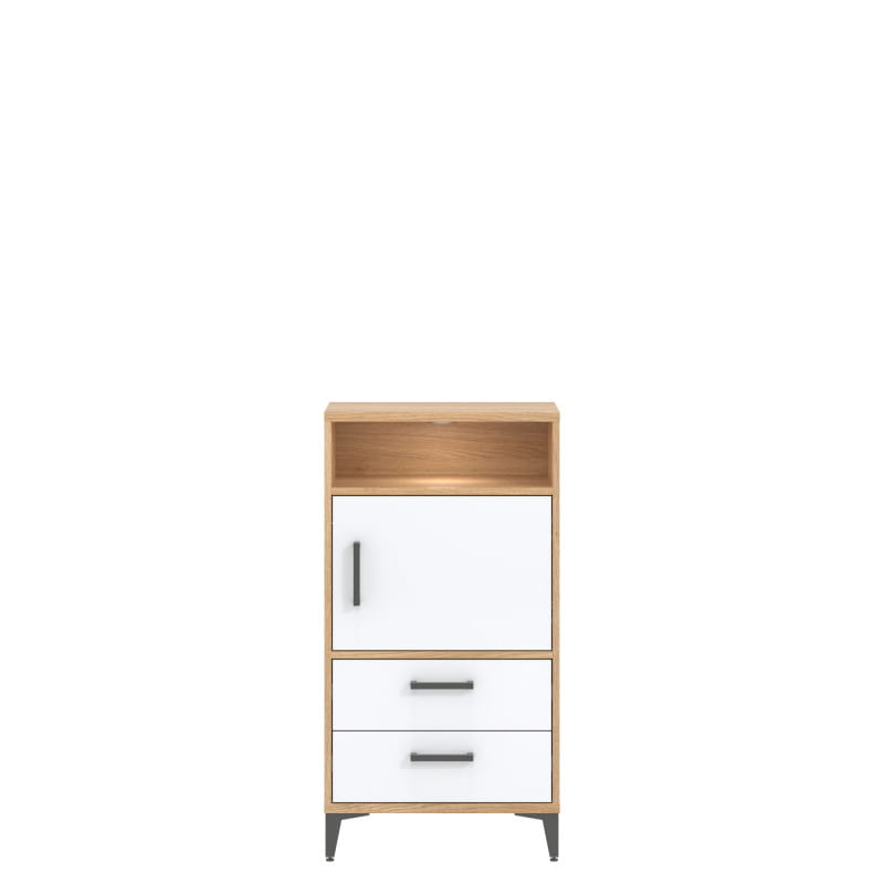 Komoda COLIN CN12 Praktyczna komoda, która łączy funkcjonalność niskiego regału i zamykanej szafki . Idealnie będzie pasowała do wielu pomieszczeń jak np. jadalni, pokoju dziennego czy garderoby. Mebel został wyposażony w dwie pojemne szuflady, zamykaną wnękę oraz półkę, które ułatwią utrzymanie porządku i segregację przechowywanych rzeczy. Komodę można doposażyć w oświetlenie LED (za dopłatą), dzięki czemu mebel zaprezentuje się elegancko. Na uwagę zasługują również minimalistyczne, szare uchwyty oraz stabilna klasyczna podstawa. Komoda idealnie sprawdzi się w kompozycji z lustrem COLIN CN 13 lub jako pojedynczy mebel, który można dopasować do własnej aranżacji pomieszczenia.