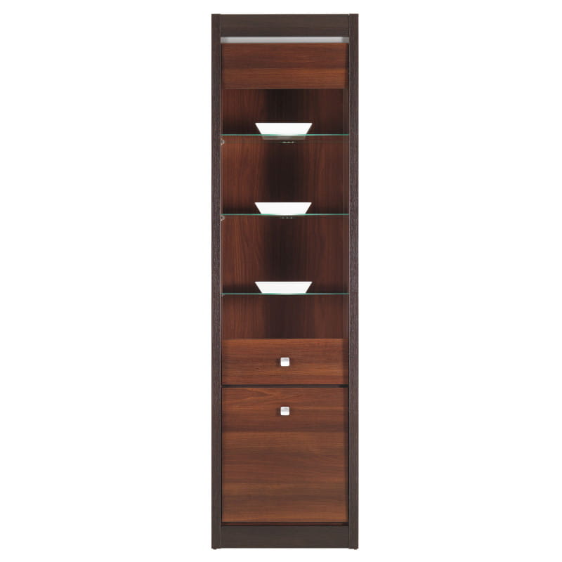 Witryna L/P FORREST FR08 to nieodłączny element salonu lub pokoju dziennego, dzięki któremu dostarczysz wnętrzu elegancji i stylowości. Kompaktowe wymiary witryny pozwolą wkomponować ją w przestrzeń o niewielkim metrażu. Przeszklenie górnej części daje możliwość wyeksponowania ozdobnych elementów, a dolna szafka pomieści pozostałe przedmioty. Witryna dostępna jest w wersji z oświetleniem LED (za dopłata), dzięki któremu wnętrze nabierze niepowtarzalnego klimatu. Jej dodatkowym atutem jest możliwość zamontowania drzwi, by otwierała się na lewą lub prawą stronę, co daje więcej możliwości pod kątem wykorzystania jej w aranżacji wnętrza. Witrynę wyróżniają nietypowe zaokrąglone brzegi, delikatne wstawki w kolorze aluminium, oraz eleganckie srebrne uchwyty z wygrawerowanym kwiatowym wzorem dodaje jej subtelności i elegancji. Efektowna masywna rama nada jej niepowtarzalnego wyglądu, a ciepła kolorystyka mebla podkreśli przytulność pomieszczenia. Witryna idealnie sprawdzi się w kompozycji z innymi bryłami z serii FORREST lub jako pojedynczy mebel, który można dopasować do własnej aranżacji pomieszczenia.