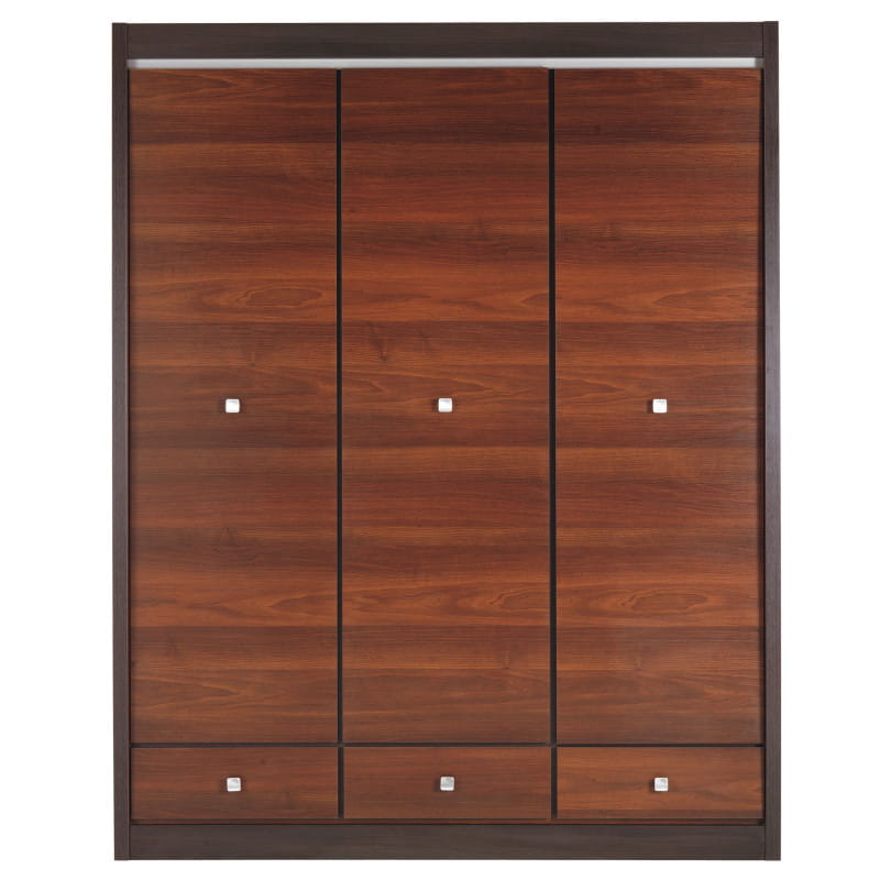 FORREST FR10 to szeroka trzydrzwiowa szafa z pojemnym wnętrzem dedykowana do sypialni, garderoby lub przedpokoju. Uniwersalny mebel, w którym wygodnie zmieścisz wszystkie ubrania i akcesoria. Szafa została podzielono na dwie części. Z jednej strony znajdziesz przestrzeń z drążkiem, gdzie odwiesisz płaszcze oraz koszule, a z drugiej pakowane półki tworzące regał na których poukładasz drobne części garderoby. W dolnej części szafy znajdują się trzy pojemne szuflady, które idealnie uzupełnią jej funkcjonalność. Szafę wyróżniają nietypowe zaokrąglone brzegi, delikatne wstawki w kolorze aluminium, oraz eleganckie srebrne uchwyty z wygrawerowanym kwiatowym wzorem dodaje jej subtelności i elegancji. Efektowna masywna rama nada jej niepowtarzalnego wyglądu, a ciepła kolorystyka mebla podkreśli przytulność pomieszczenia. Szafa idealnie sprawdzi się w kompozycji z innymi bryłami z serii FORREST lub jako pojedynczy mebel, który można dopasować do własnej aranżacji pomieszczenia.