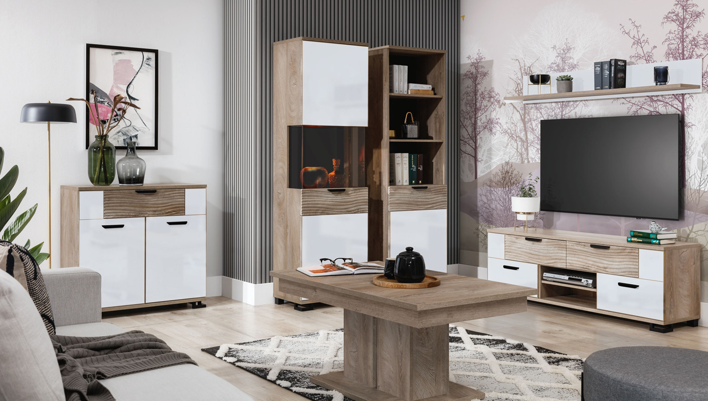 Komoda GT02 to mebel, który sprawdzi się zarówno w salonie, jadalni jak i pokoju dziennym. Komoda jest bardzo praktyczna i pojemna, posiada szufladę w górnej części mebla i podwójną zamykaną szafkę, które pozwolą uporządkować potrzebne drobiazgi. Atrakcyjny wygląd mebla nada Twojemu pomieszczeniu niepowtarzalnego charakteru. Modne połączenie kolorystyczne wraz z oryginalnym ryflowaniem na froncie przykuwa uwagę. Komoda idealnie sprawdzi się w konfiguracji z innymi bryłami z serii G-TE lub jako pojedynczy mebel, który można dopasować do własnej aranżacji pomieszczenia.enia.