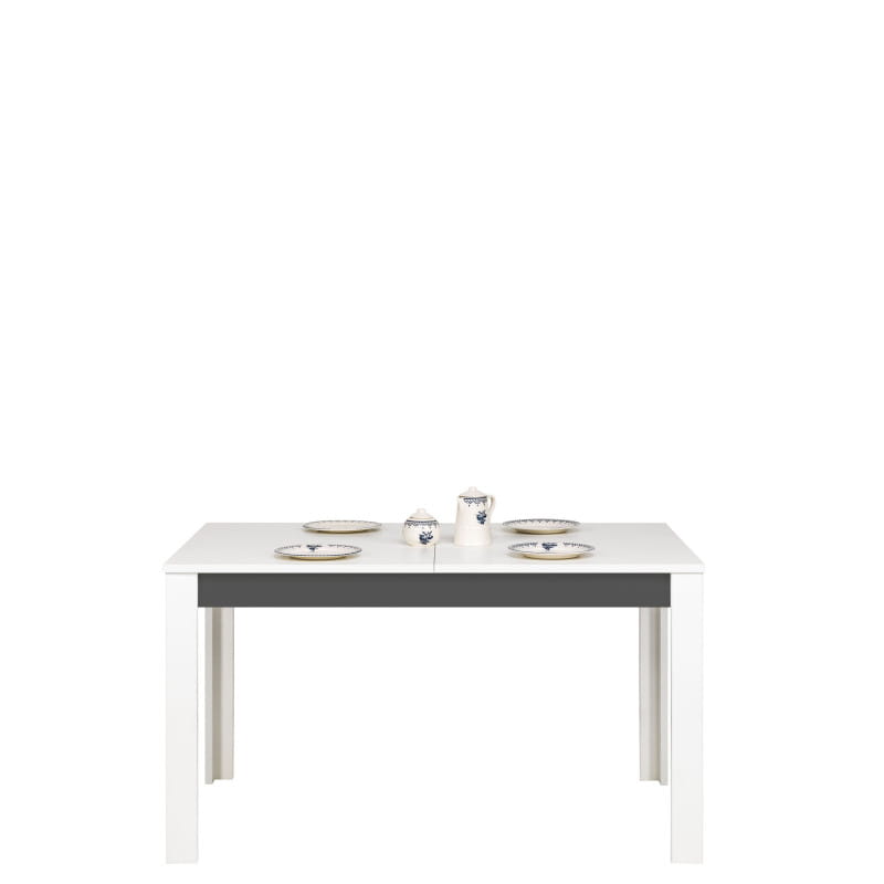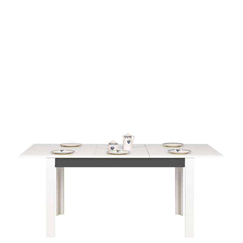 Stół GRAY GR11 to idealny dodatek do salonu oraz jadalni. Jest funkcjonalny i praktyczny, sprawdzi się zarówno w codziennym użytkowaniu jak i podczas większych spotkań rodzinnych. Posiada funkcję rozkładania (wkładka 50 cm) dlatego można go szybko i bez wysiłku rozłożyć do długości 185 cm. Nowoczesna kolorystyka, w której połączono matową biel i grafit pozwoli stworzyć idealne wnętrze, dostosowane do gustu i wymagań jego użytkowników. Stół idealnie sprawdzi się w konfiguracji z innymi bryłami z serii GRAY lub jako pojedynczy mebel, który można dopasować do własnej aranżacji pomieszczenia.