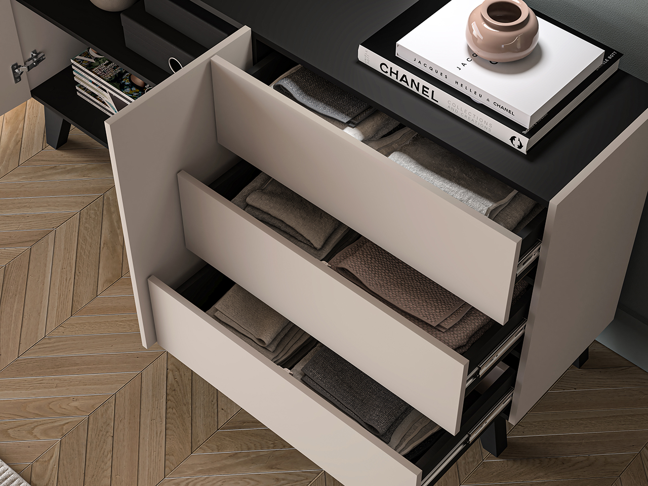 Duża komoda Freshion 03 to idealny mebel do przechowywania. Za podwójnymi drzwiczkami kryją się dwie pojemne wnęki. Przechowasz w nich ubrania, ręczniki czy zastawę stołową. Drugą część mebla tworzą trzy szerokie szuflady, idealne na obrusy i bieliznę. Szeroki blat będzie idealnym miejscem do wyeksponowania eleganckich wazonów lub pamiątek z podróży.