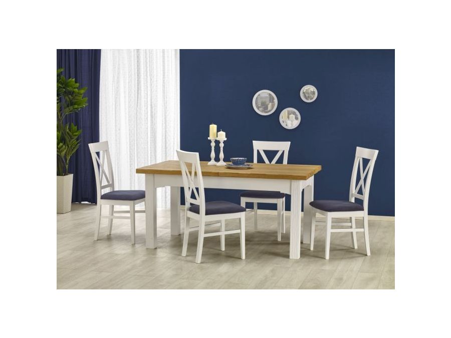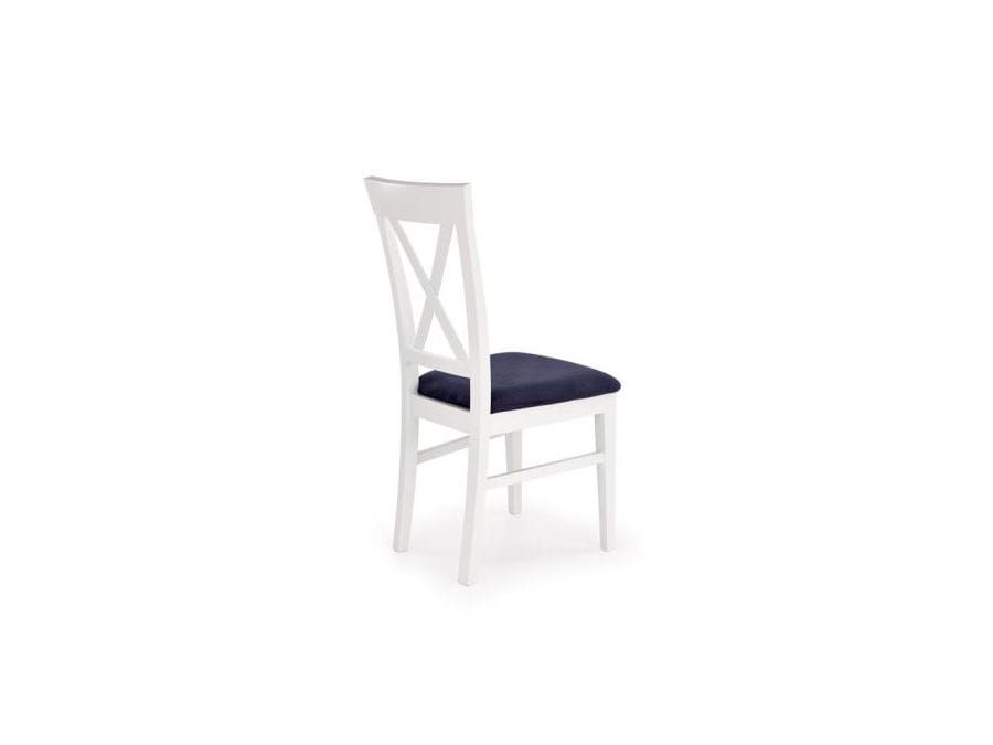 Krzesło Bergamo to eleganckie białe krzesło drewniane z tapicerowanym tkaniną siedziskiem w wyjątkowym granatowym kolorze, razem tworząc wyjątkowy duet.