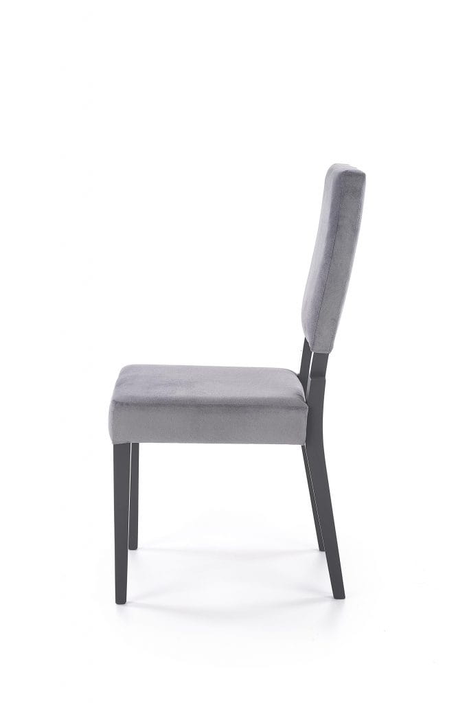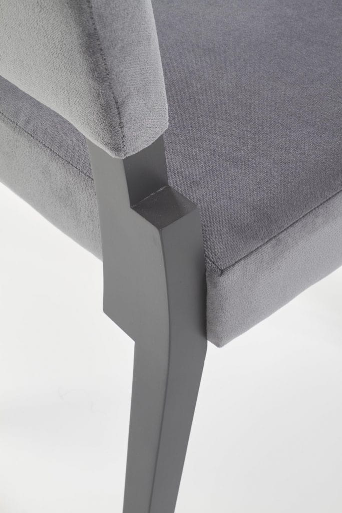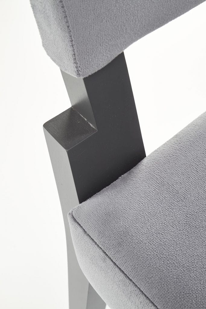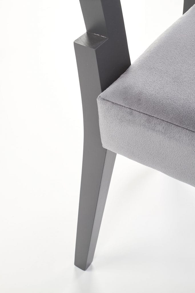Krzesło SORBUS posiada miękkie i wygodne oparcie oraz siedzisko tapicerowane szarą tkaniną materiałową. Nogi krzesła w kolorze grafitowym wykonane zostały z litego drewna bukowego.