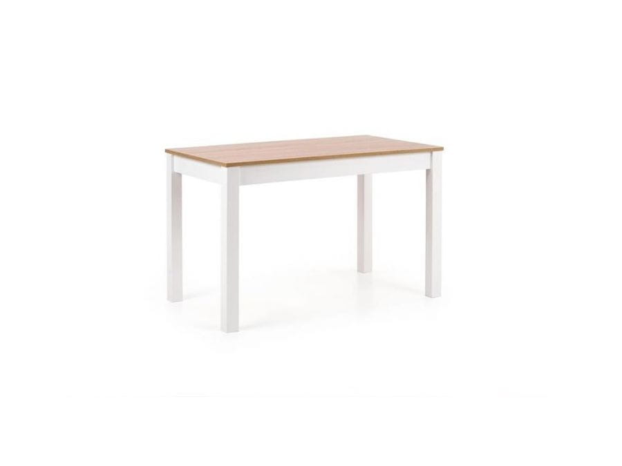 Stół KSAWERY to atrakcyjny stół do jadalni, posiada blat wykonany z płyty laminowanej w kolorze dąb sonoma oraz białe nogi.